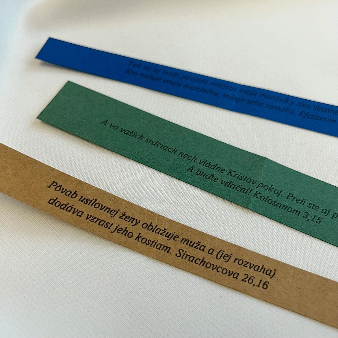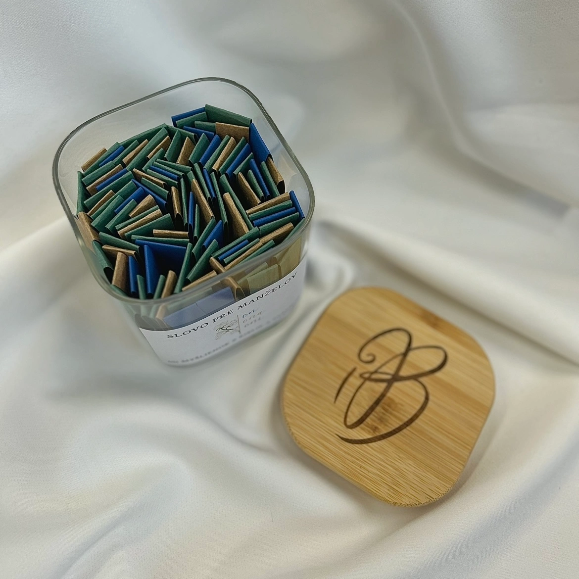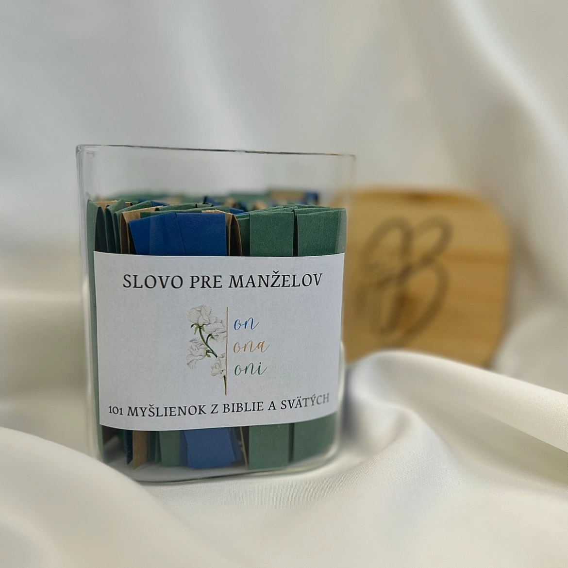 Manželské sklíčko obsahuje verše z Biblie a myšlienky svätých v troch farbách. Zlatá je slovo pre ňu, modrá pre neho a zelená pre manželov spolu. Takýmto spôsobom necháte viac Boha hovoriť do vášho manželstva a utvrdíte sa vo svojej identite ako muž alebo žena. Sklíčko obsahuje 101 myšlienok.