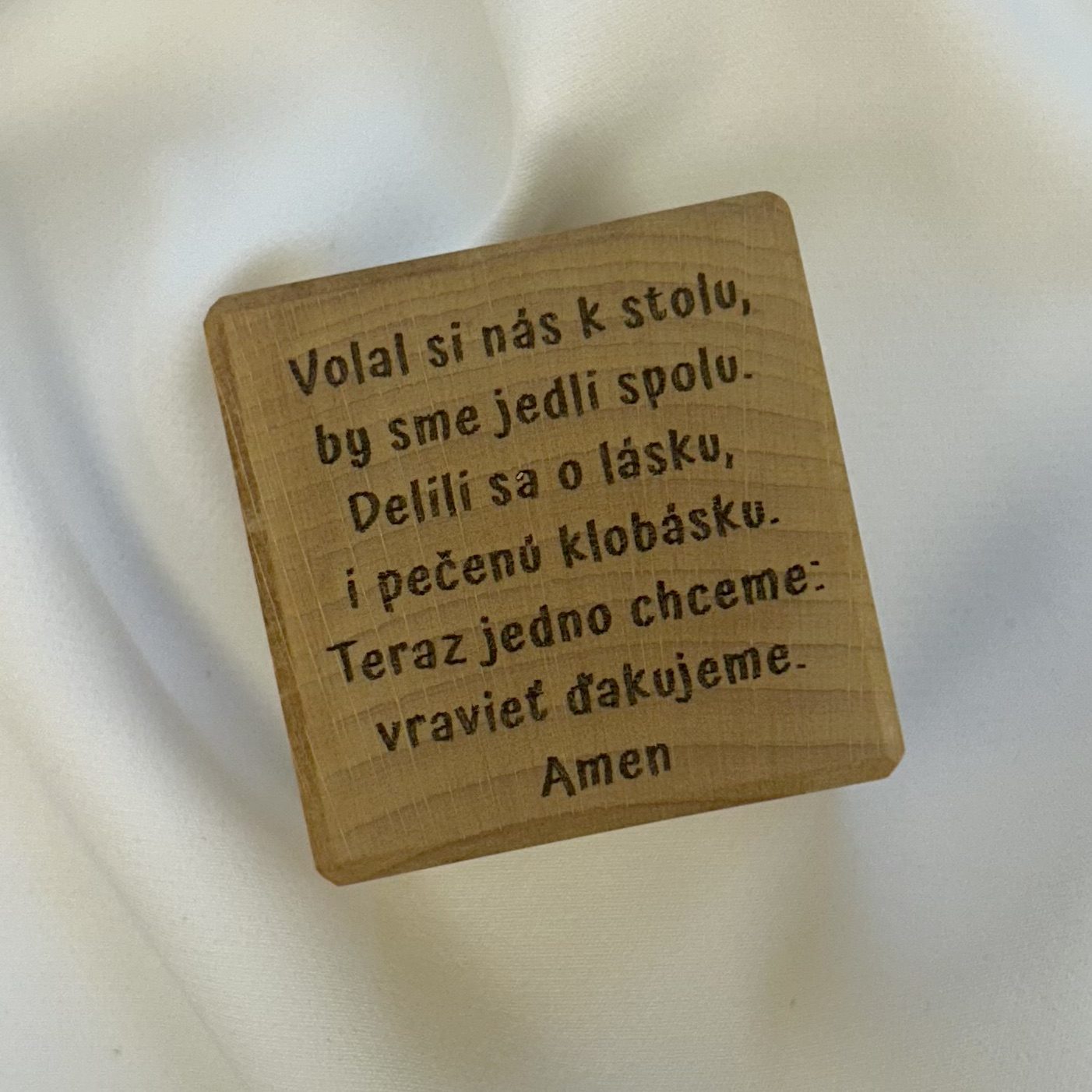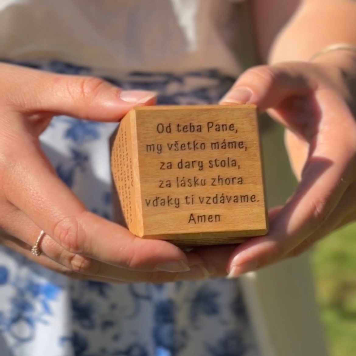 Modlikocka na každej strane obsahuje modlitbu pred jedlom pre deti. Takýmto spôsobom sa počas spoločnej modlitby rodina viac zblíži a hravým spôsobom deti prehĺbia svoj vzťah s modlitbou a Bohom.