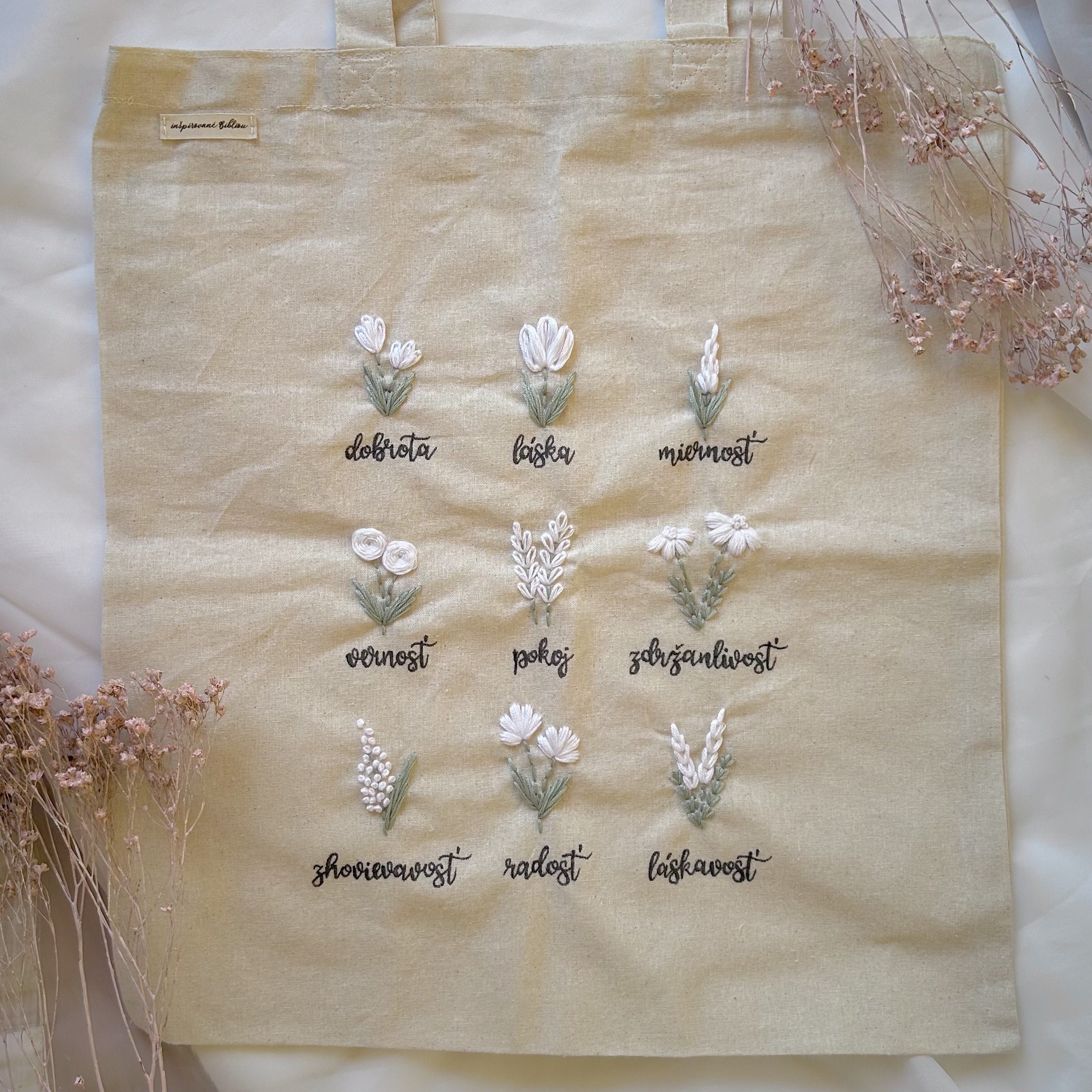 Vyšívaná taška ovocie Ducha – biela